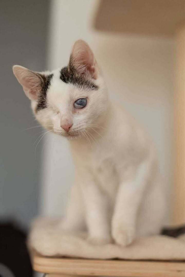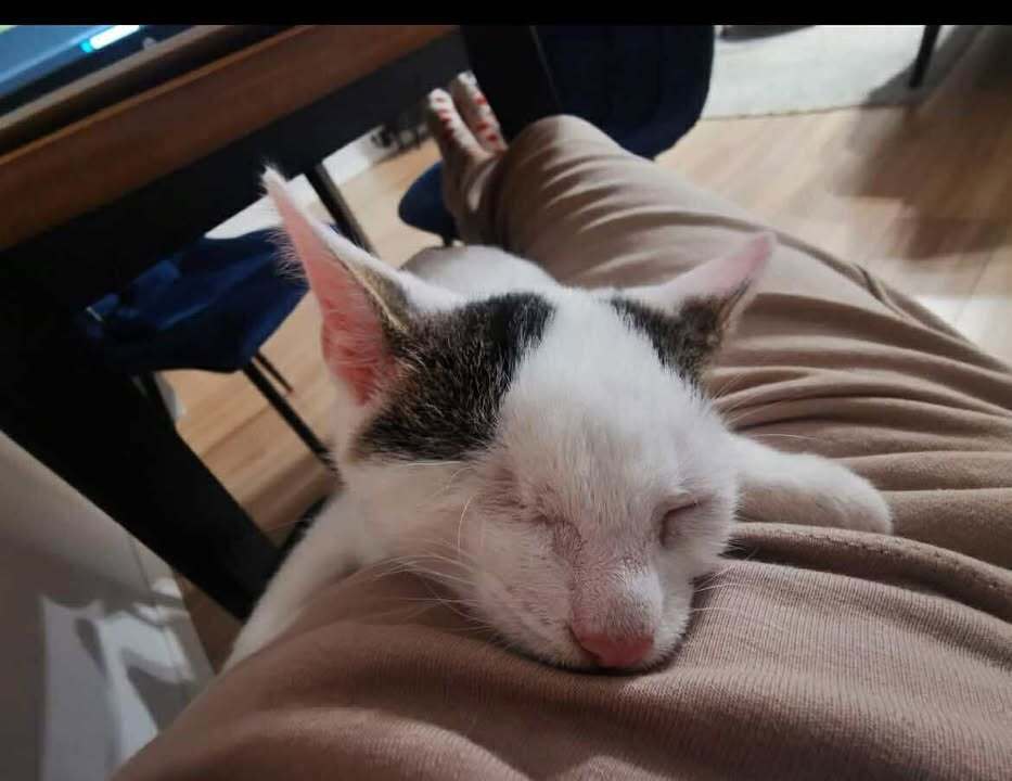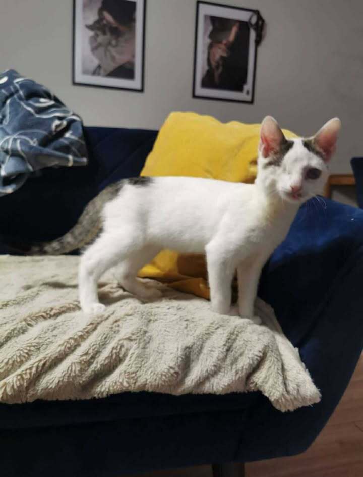 Remigiusz ma 4 miesiące i mimo braku jednego oczka świetnie sobie radzi. To ogromny pieszczoch, kocha ludzi, przytulanie i wspólne spanie. Lubi inne koty, choć bywa wobec nich natarczywy. Pięknie korzysta z kuwety i drapaka, nie jest wybredny. Szuka spokojnego, niewychodzącego domku.
